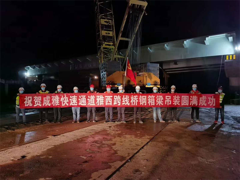 雅西跨線(xiàn)橋是成雅快速通道(雅安段)新建工程重要組成部分,該橋?yàn)閱慰绾?jiǎn)支鋼箱梁橋,全橋設(shè)計(jì)鋼箱梁4片,單片重量約140噸、長(zhǎng)55余米,體積大、自身重、運(yùn)輸困難,且投入的大型機(jī)械設(shè)備較多,施工組織難度大。為順利完成架設(shè)任務(wù),市交通局會(huì)同市交建集團(tuán)、交建項(xiàng)目管理公司、市公安局交警支隊(duì)和各參建單位多次組織召開(kāi)專(zhuān)題會(huì)議,提前謀劃、細(xì)致安排、優(yōu)化組織,制定了施工專(zhuān)項(xiàng)方案和應(yīng)急措施,使整個(gè)施工過(guò)程按照標(biāo)準(zhǔn)化、程序化、規(guī)范化進(jìn)行施工,為鋼箱梁的成功吊裝奠定了堅(jiān)實(shí)的基礎(chǔ)。