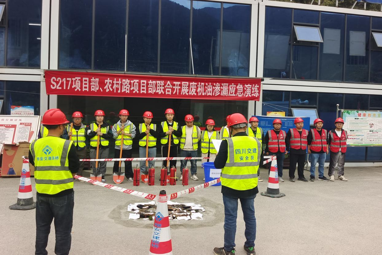 為提高項(xiàng)目管理人員與勞務(wù)人員應(yīng)對廢機(jī)油滲漏突發(fā)事件的能力,10月25日,雅安交建集團(tuán)路橋公司S217石棉縣王崗坪至石棉縣城段災(zāi)后恢復(fù)重建工程項(xiàng)目部、“9.5”瀘定地震石棉縣受損農(nóng)村公路災(zāi)后恢復(fù)重建工程項(xiàng)目部、石棉縣農(nóng)村公路改造提升工程項(xiàng)目部,聯(lián)合開展環(huán)保廢機(jī)油處置應(yīng)急演練。