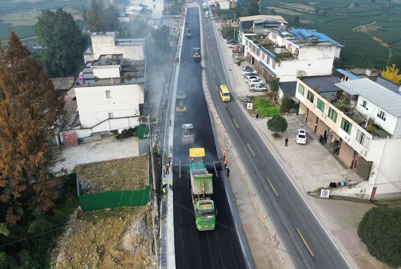 國道318線名山區(qū)黑竹(成都界)至雨城區(qū)多營段改建項目作為四川省重點項目,同時也是雅安“三區(qū)”同城化經(jīng)濟環(huán)線中北環(huán)線的重要組成部分,自開工以來始終保持高效推進態(tài)勢。為實現(xiàn)2026年春節(jié)前主體工程貫通目標(biāo),近期,項目建設(shè)現(xiàn)場掀起“大干快上”熱潮,全體參建單位以“時不我待”的緊迫感沖刺節(jié)點任務(wù),各項工作取得突破性進展。截至目前,項目累計完成投資24.95億元,完成產(chǎn)值17.6億元;路基、橋涵、隧道工程均完成90%以上,陸續(xù)進入路面工程階段,前12公里改建段已建成通車。