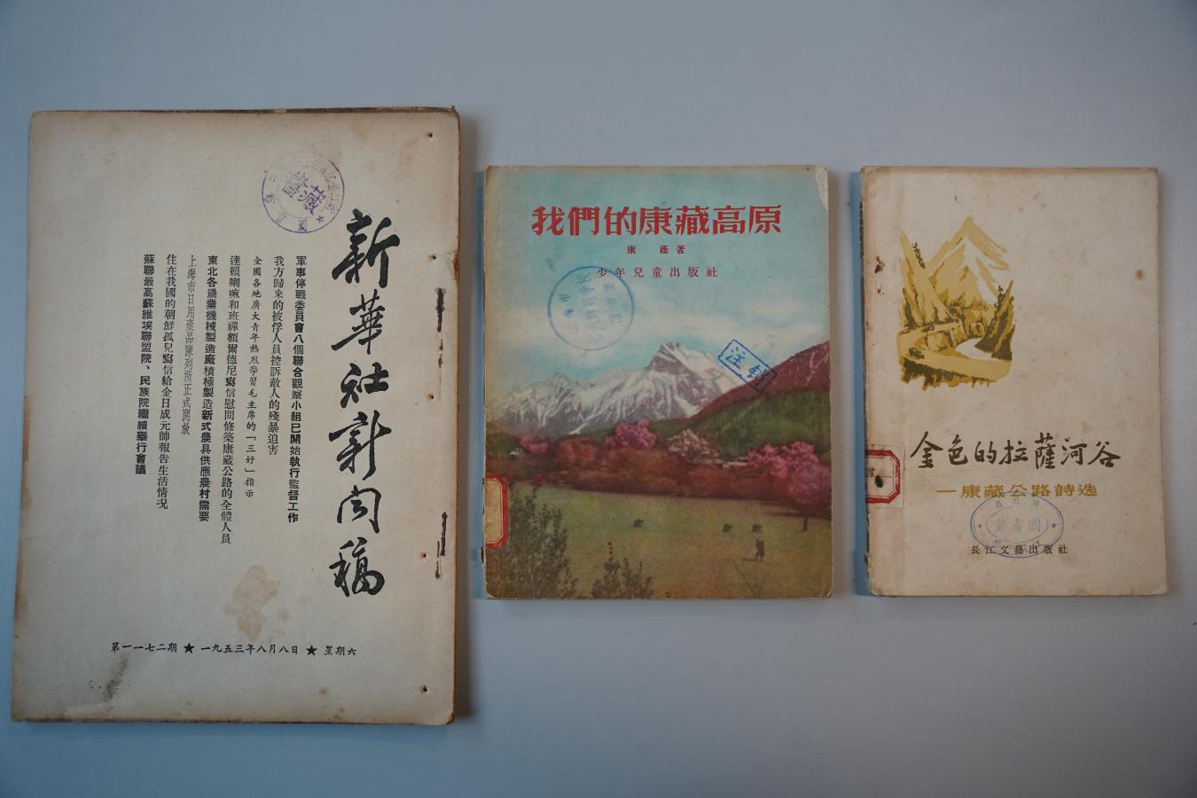 此次獲贈(zèng)文獻(xiàn)具有重要?dú)v史價(jià)值,《金色的拉薩河谷(康藏公路詩(shī)選)》以詩(shī)歌形式記錄了康藏公路(今川藏公路)建設(shè)者的奮斗歷程,其中的不少詩(shī)篇被作曲家譜寫成歌曲;《我們的康藏高原》著重描寫了康藏公路的修筑歷程,講述了筑路英雄們的事跡及西藏和平解放后的新面貌;1953年8月8日發(fā)表的新華社新聞稿原件,以第一手資料還原了康藏公路修建期間的重要?dú)v史節(jié)點(diǎn)。
