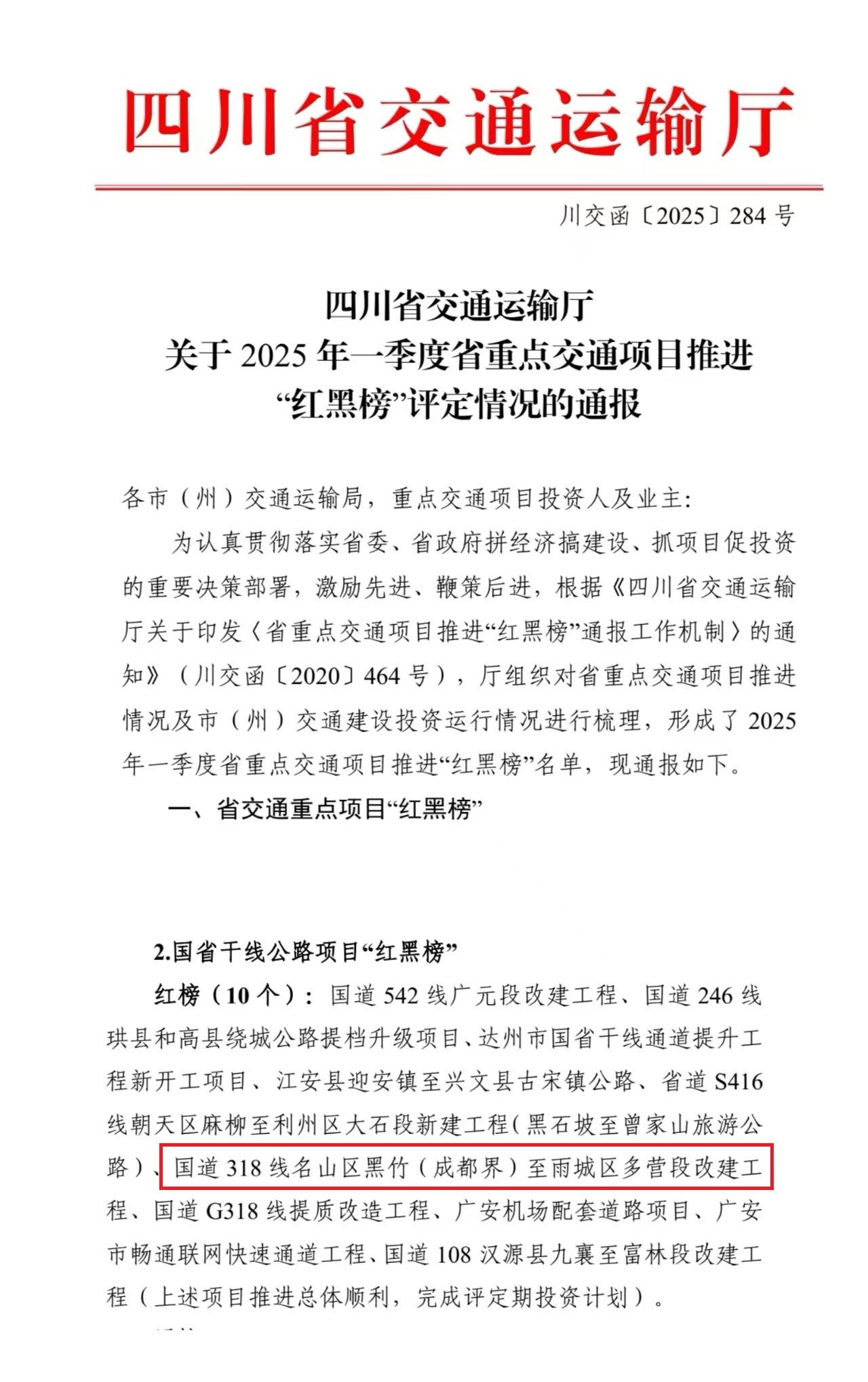 近日,四川省交通運輸廳發(fā)布2025年一季度省重點交通項目推進“紅黑榜”評選結(jié)果,由雅安交建集團四川康藏路橋有限責(zé)任公司承建的國道318線名山區(qū)黑竹(成都界)至雨城區(qū)多營段改建工程憑借超額完成投資計劃、關(guān)鍵節(jié)點取得突破等成效,成功入選國省干線公路項目“紅榜”。