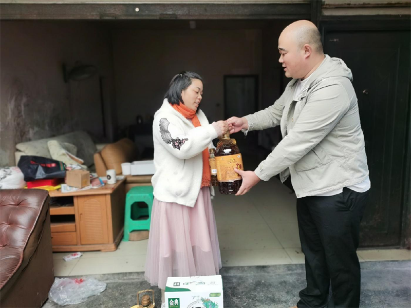 10月18日下午,雅安交建集團(tuán)運(yùn)通貿(mào)易有限公司黨員干部在雨城區(qū)青江街道石馬社區(qū)工作人員的帶領(lǐng)下,前往“一對一”幫扶對象黃非女士家中,為她送去了大米、食用油、牛奶等慰問品。