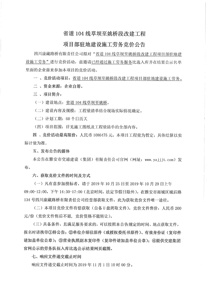 四川康藏路橋有限責(zé)任公司省道104線草壩至姚橋段改建工程項目部駐地建設(shè)施工勞務(wù)競價公告