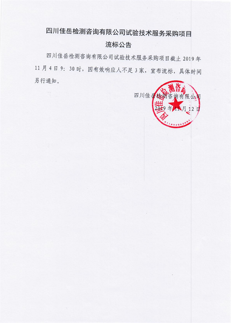 四川佳岳檢測咨詢有限公司試驗技術服務采購項目流標公告