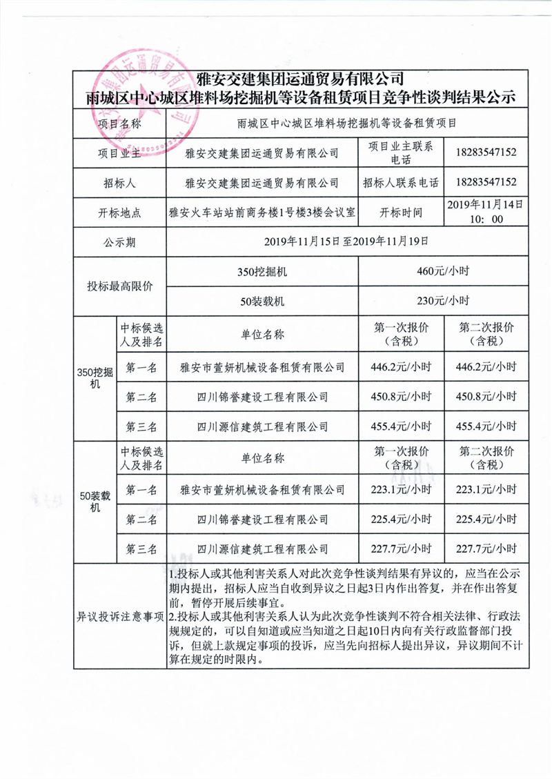 雅安交建集團運通貿(mào)易有限公司雨城區(qū)中心城區(qū)堆料場挖掘機等設備租賃項目競爭性談判結果公示