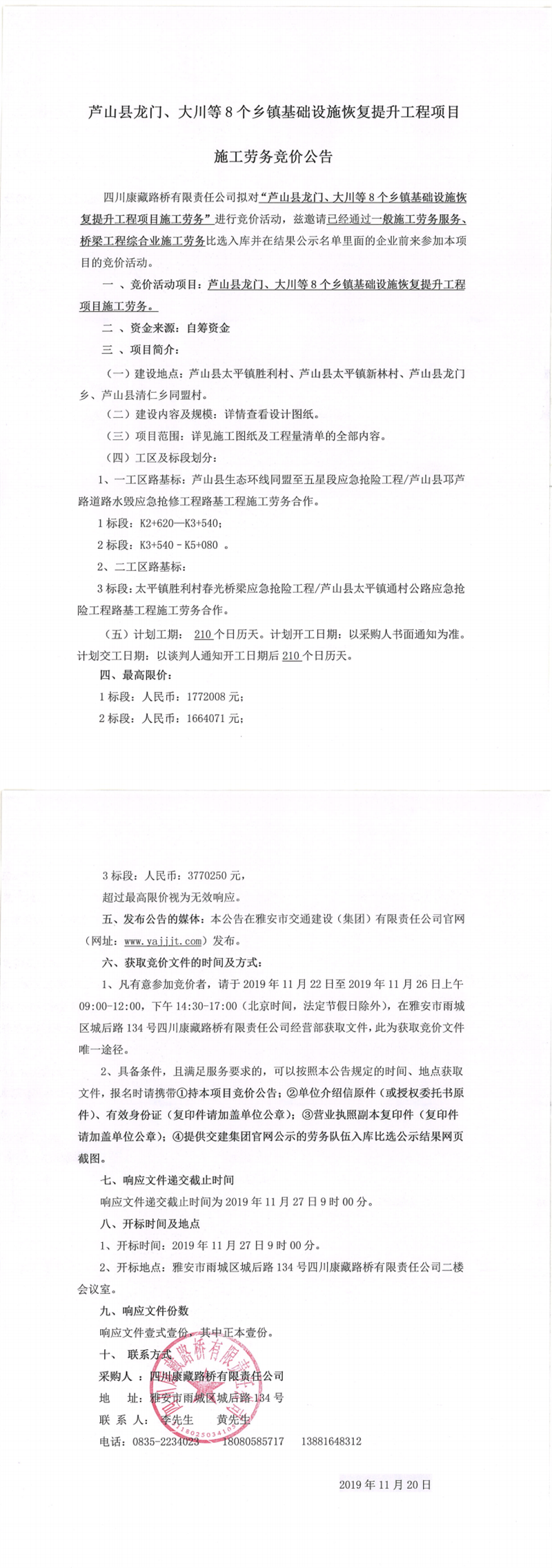 四川康藏路橋有限責任公司蘆山縣龍門、大川等8個鄉(xiāng)鎮(zhèn)基礎設施恢復提升工程項目施工勞務競價公告