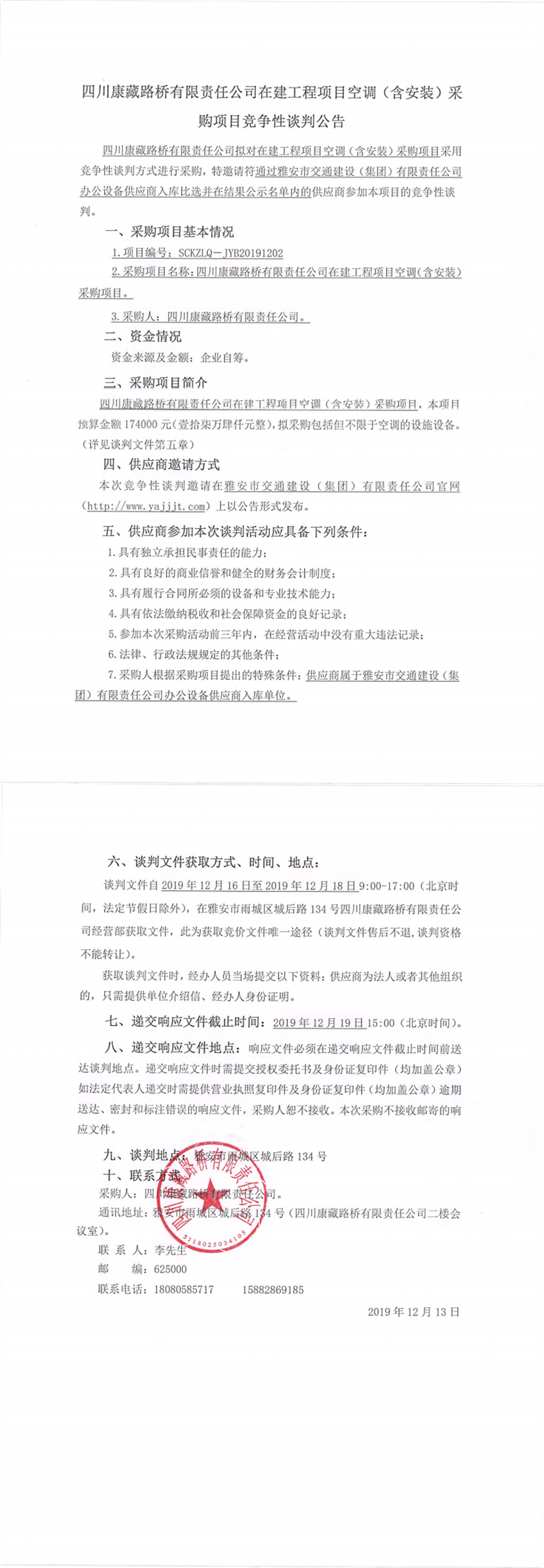 四川康藏路橋有限責任公司在建工程項目空調(含安裝)采購項目競爭性談判公告