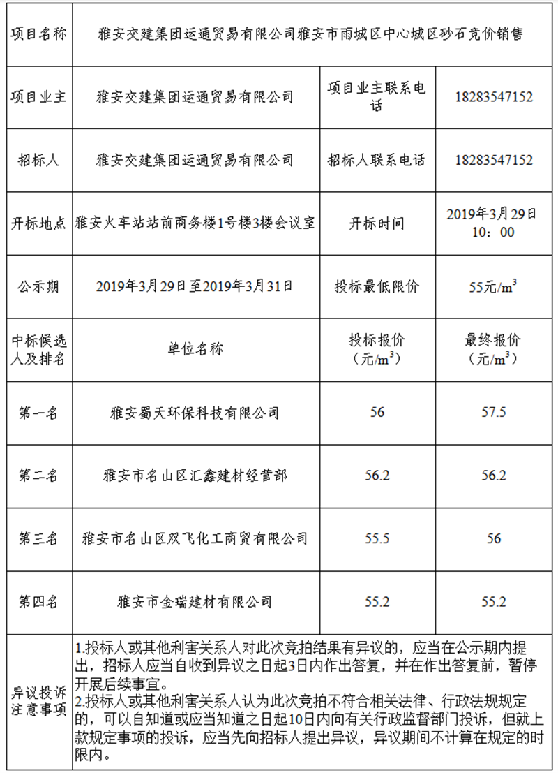 雅安交建集團(tuán)運(yùn)通貿(mào)易有限公司關(guān)于雅安市雨城區(qū)中心城區(qū)砂石競(jìng)拍結(jié)果公示