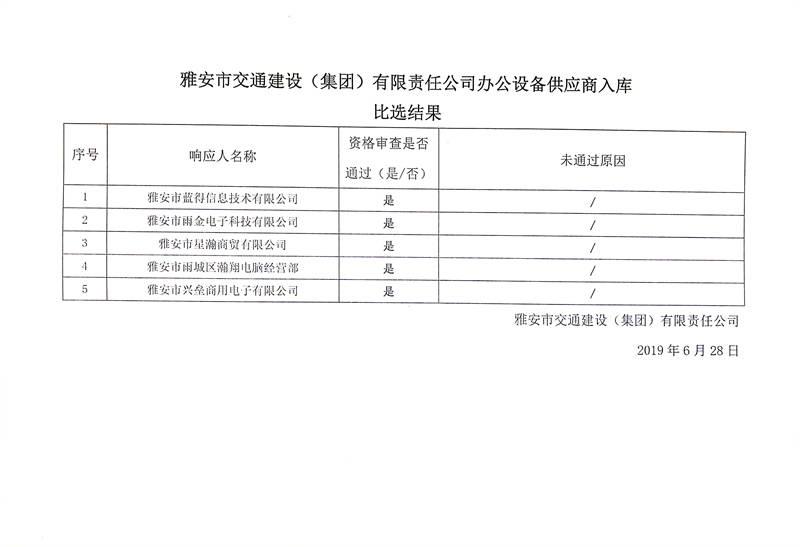 雅安市交通建設(shè)(集團)有限責(zé)任公司辦公設(shè)備供應(yīng)商入庫比選結(jié)果