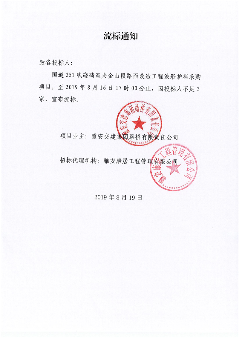 雅安交建集團(tuán)路橋有限責(zé)任公司國道351線磽磧至夾金山段路面改造工程波形護(hù)欄采購項目流標(biāo)通知
