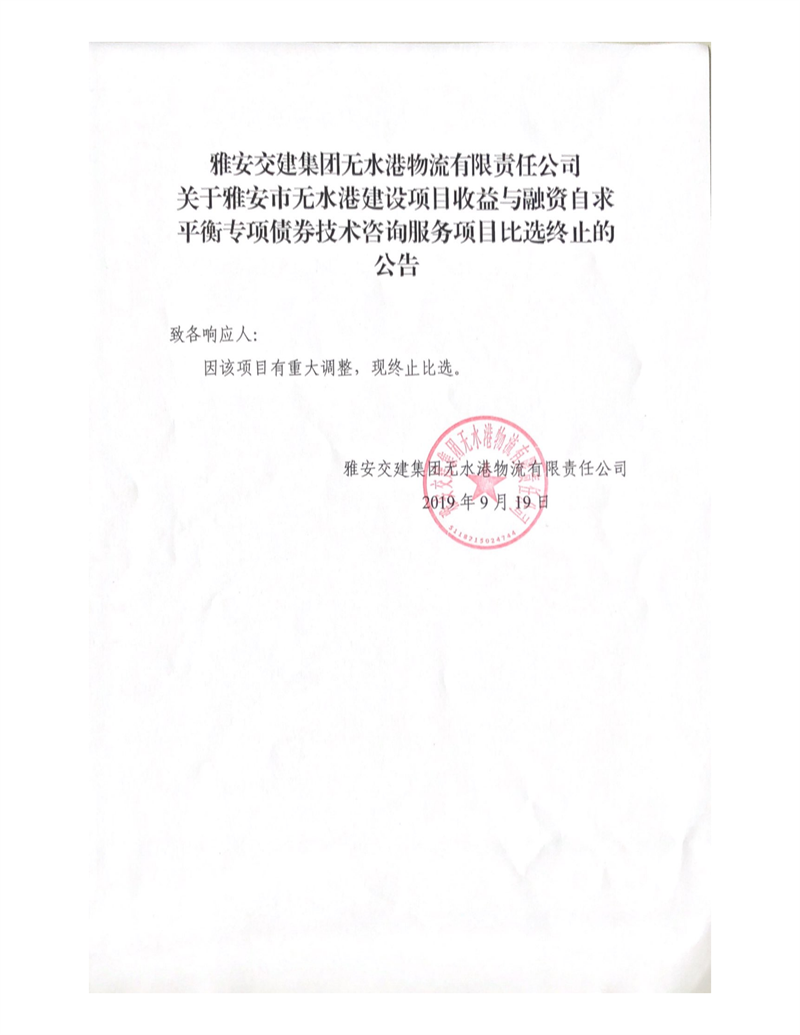雅安交建集團(tuán)無水港物流有限責(zé)任公司關(guān)于雅安市無水港建設(shè)項目收益與融資自求平衡專項債券技術(shù)咨詢服務(wù)項目比選終止的公告
