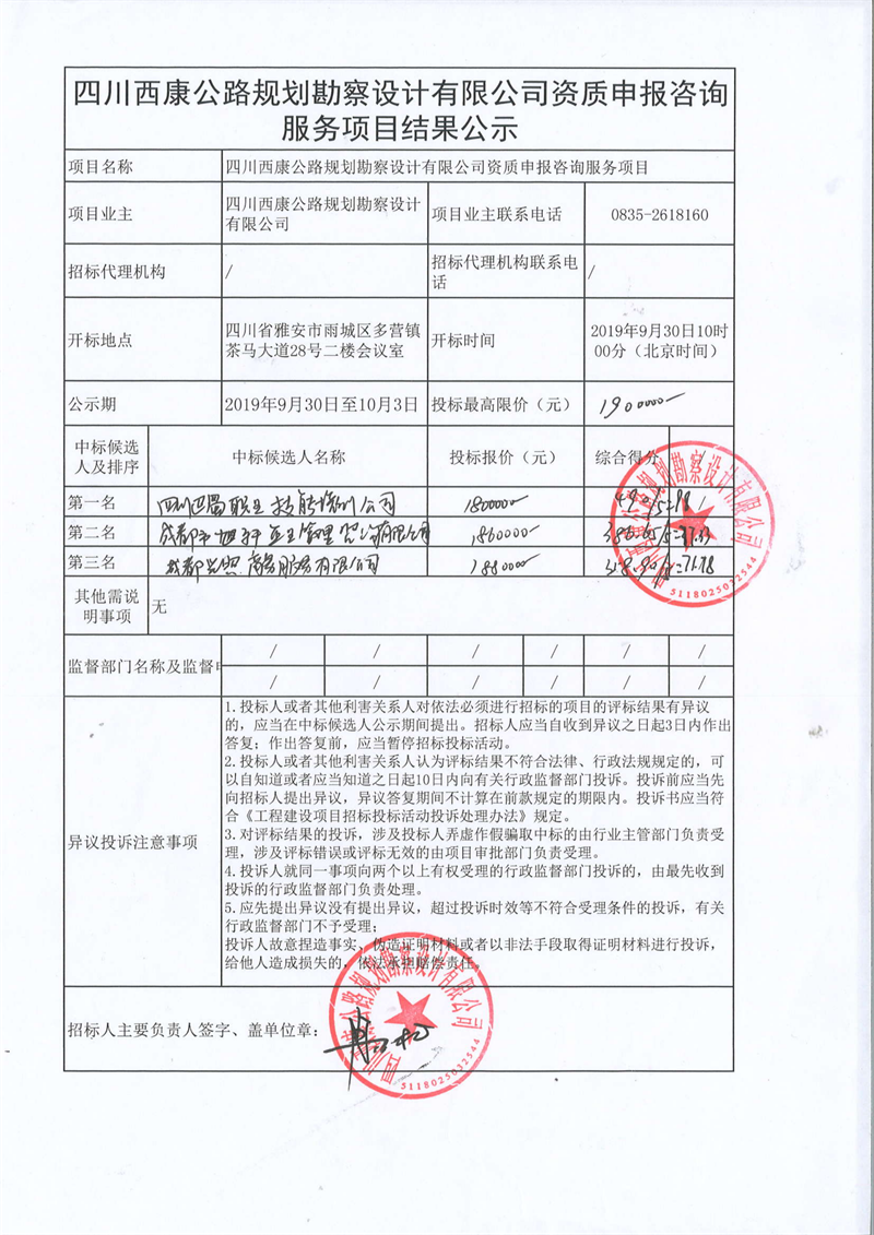 四川西康公路規(guī)劃勘察設(shè)計有限公司資質(zhì)申報咨詢服務(wù)項目結(jié)果公示