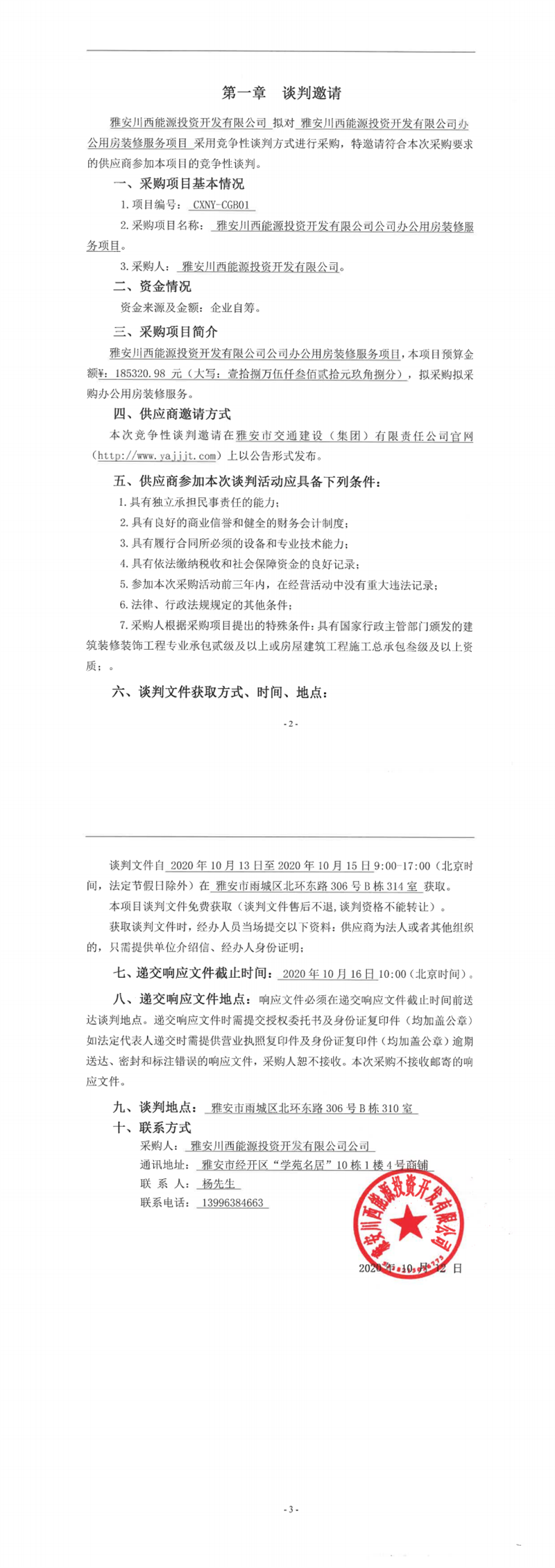 雅安川西能源投資開發(fā)有限公司辦公用房裝修服務項目競爭性談判公告
