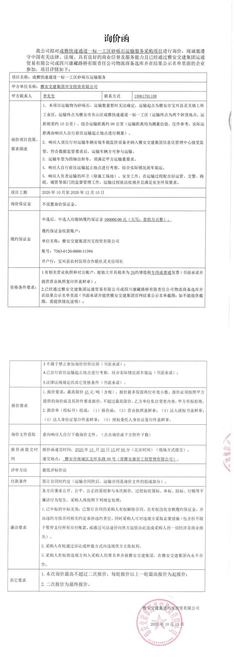 雅安交建集團(tuán)興寶投資有限公司成雅快速通道一標(biāo)一工區(qū)砂礫石運(yùn)輸服務(wù)采購項(xiàng)目詢價函