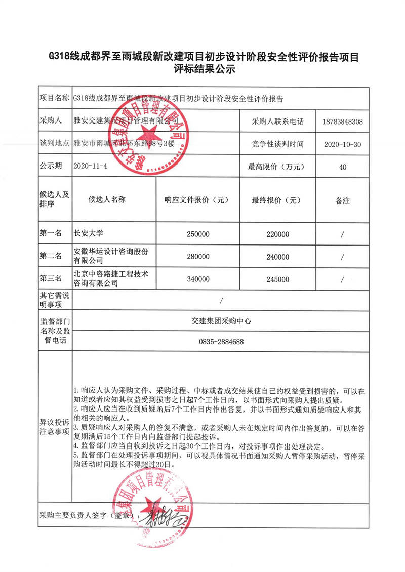 雅安交建集團項目管理有限公司G318線成都界至雨城段新改建項目初步設(shè)計階段安全性評價報告項目評標(biāo)結(jié)果公示