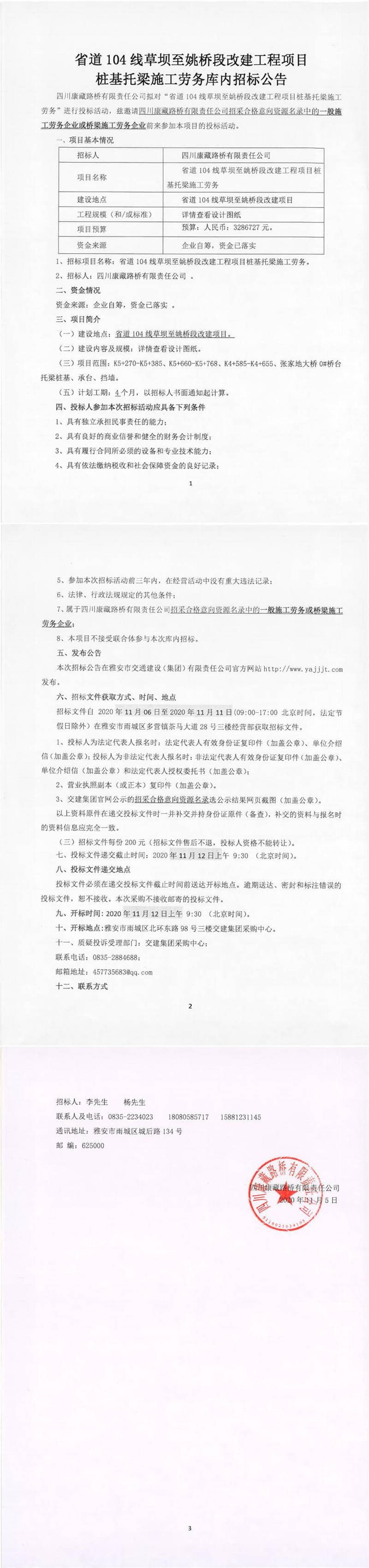 四川康藏路橋有限責任公司省道104線草壩至姚橋段改建工程項目樁基托梁施工勞務庫內招標公告