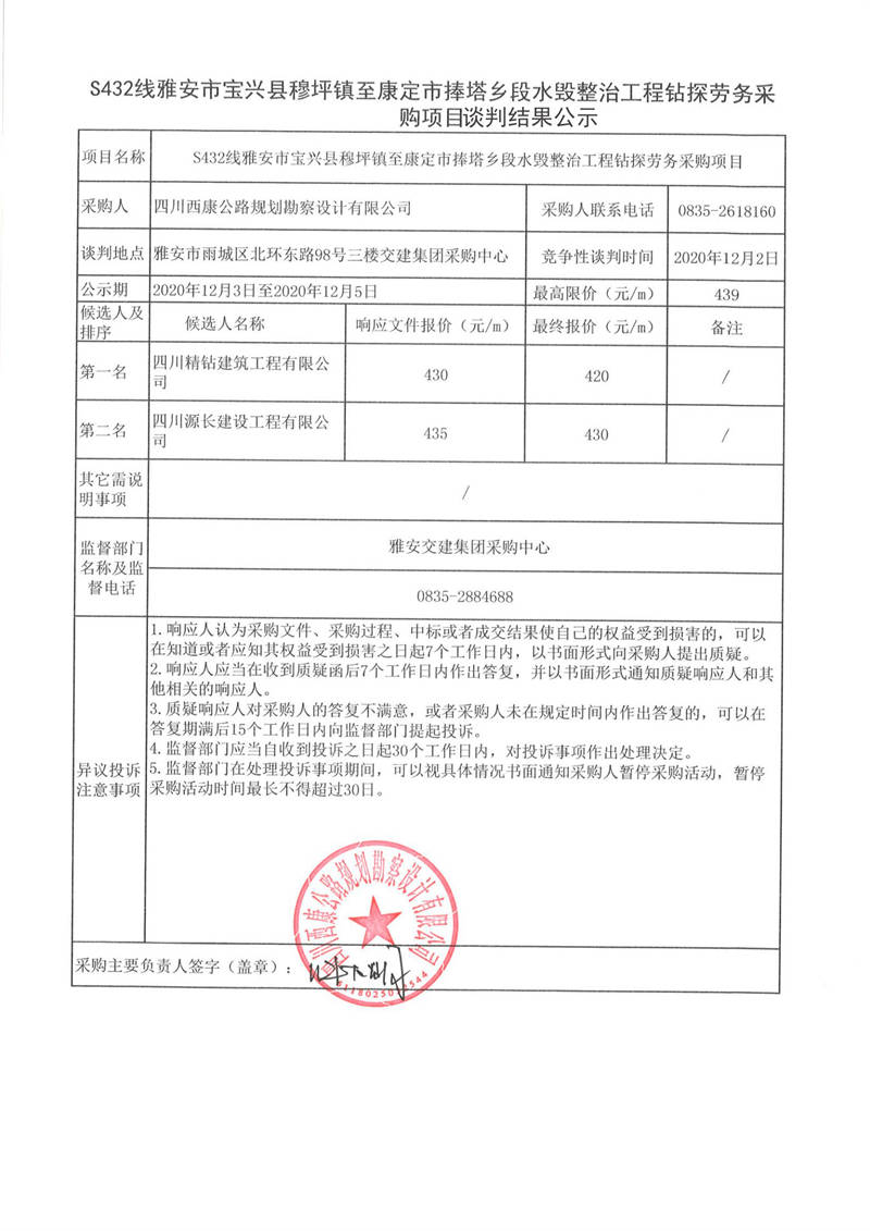 四川西康公路規(guī)劃勘察設計有限公司S432線雅安市寶興縣穆坪鎮(zhèn)至康定市捧塔鄉(xiāng)段水毀整治工程鉆探勞務采購項目談判結果公示