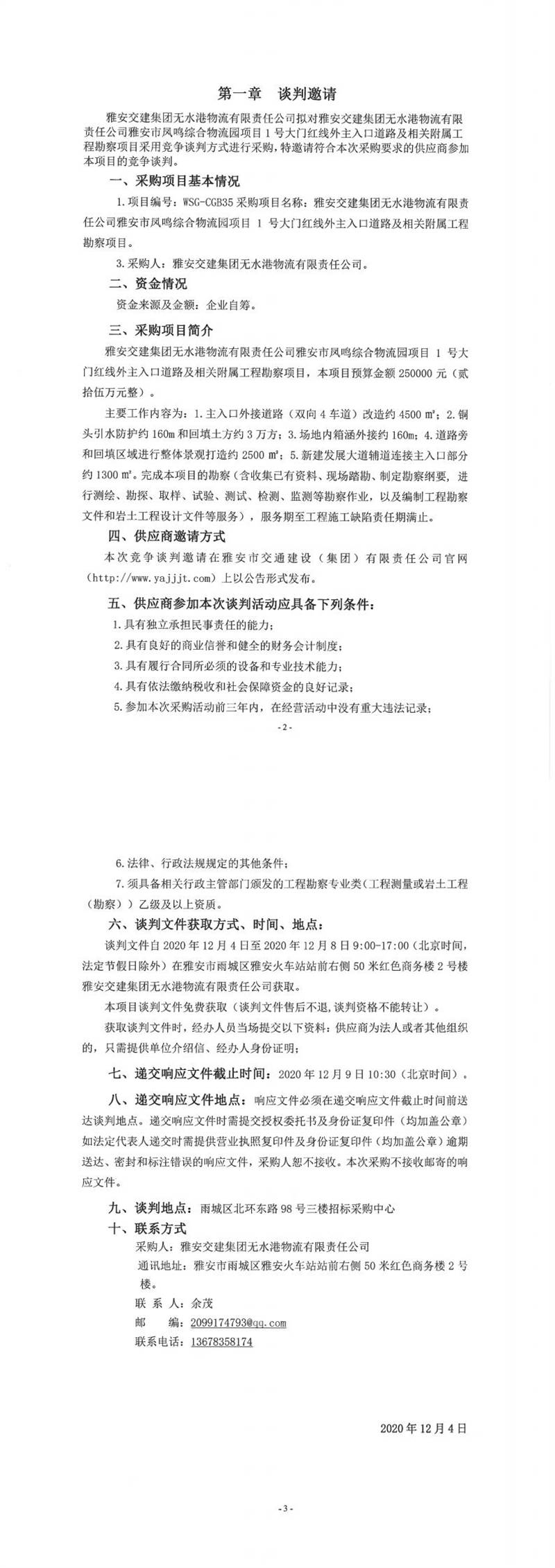 雅安交建集團無水港物流有限責(zé)任公司雅安市鳳鳴綜合物流園項目1號大門紅線外主入口道路及相關(guān)附屬工程勘察項目談判公告