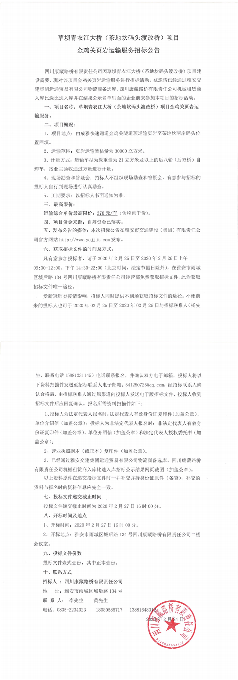 四川康藏路橋有限責任公司草壩青衣江大橋(茶地坎碼頭渡改橋)項目金雞關(guān)頁巖運輸服務招標公告