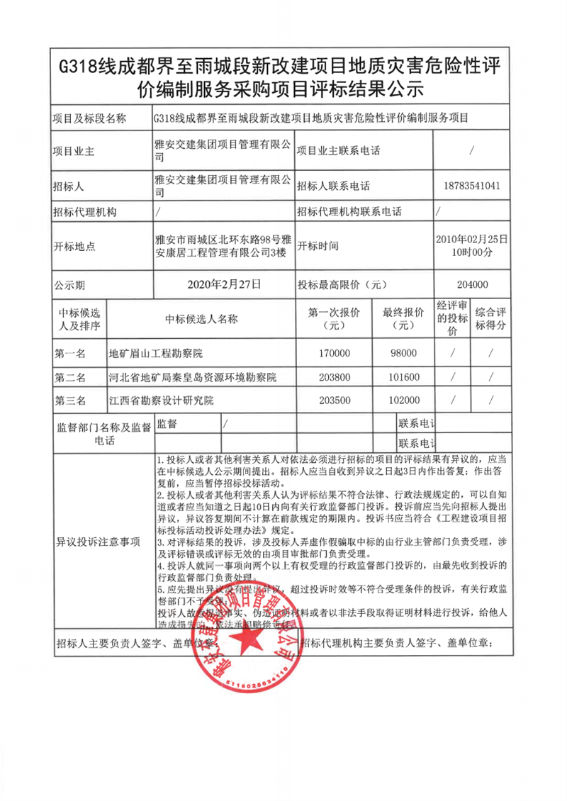雅安交建集團項目管理有限公司G318線成都界至雨城段新改建項目地質災害危險性評價編制服務項目評標結果公示