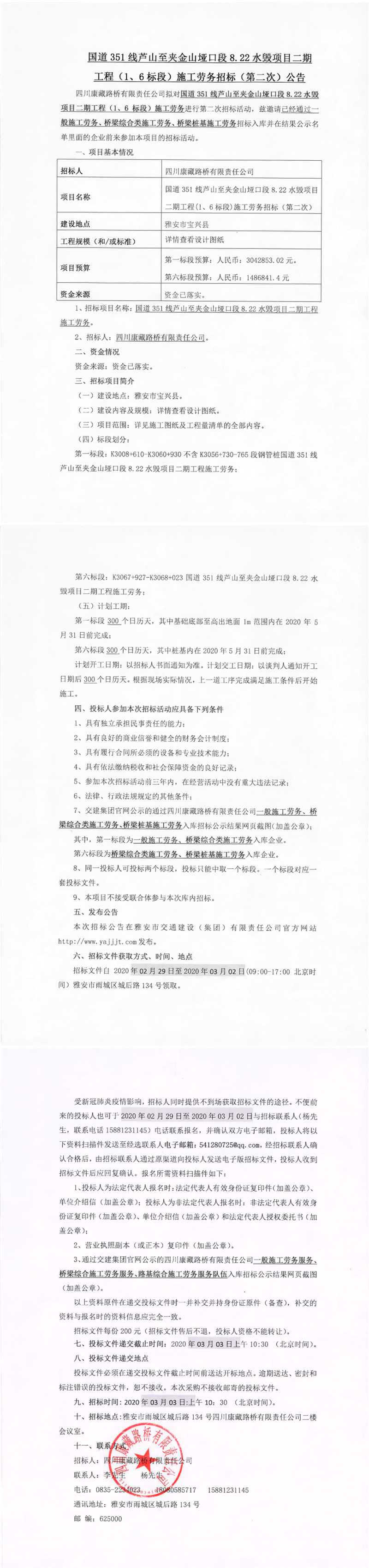 四川康藏路橋有限責(zé)任公司國(guó)道351線蘆山至夾金山埡口8.22水毀項(xiàng)目二期工程(1、6標(biāo)段)施工勞務(wù)招標(biāo)(第二次)公告