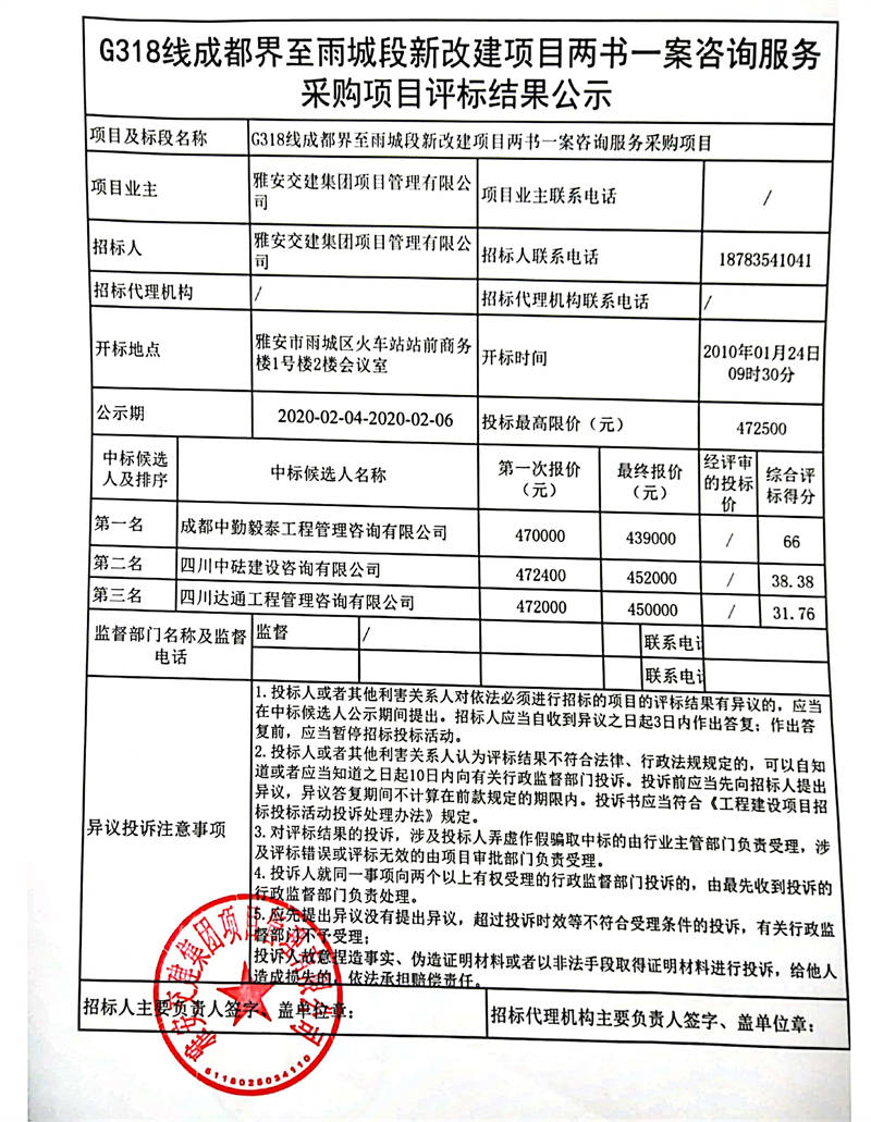 雅安交建集團(tuán)項(xiàng)目管理有限公司G318線成都界至雨城段新改建項(xiàng)目?jī)蓵?shū)一案咨詢服務(wù)采購(gòu)項(xiàng)目評(píng)標(biāo)結(jié)果公示