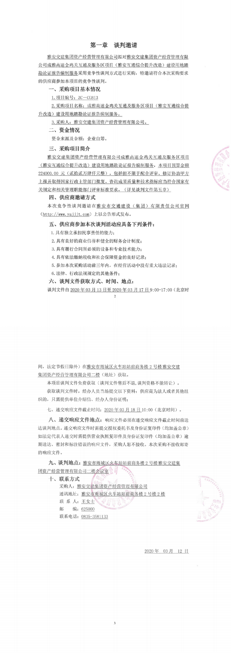雅安交建集團資產經營管理有限公司成雅高速金雞關互通及服務區(qū)項目(雅安互通綜合提升改造)建設用地踏勘論證報告編制服務競爭性談判公告