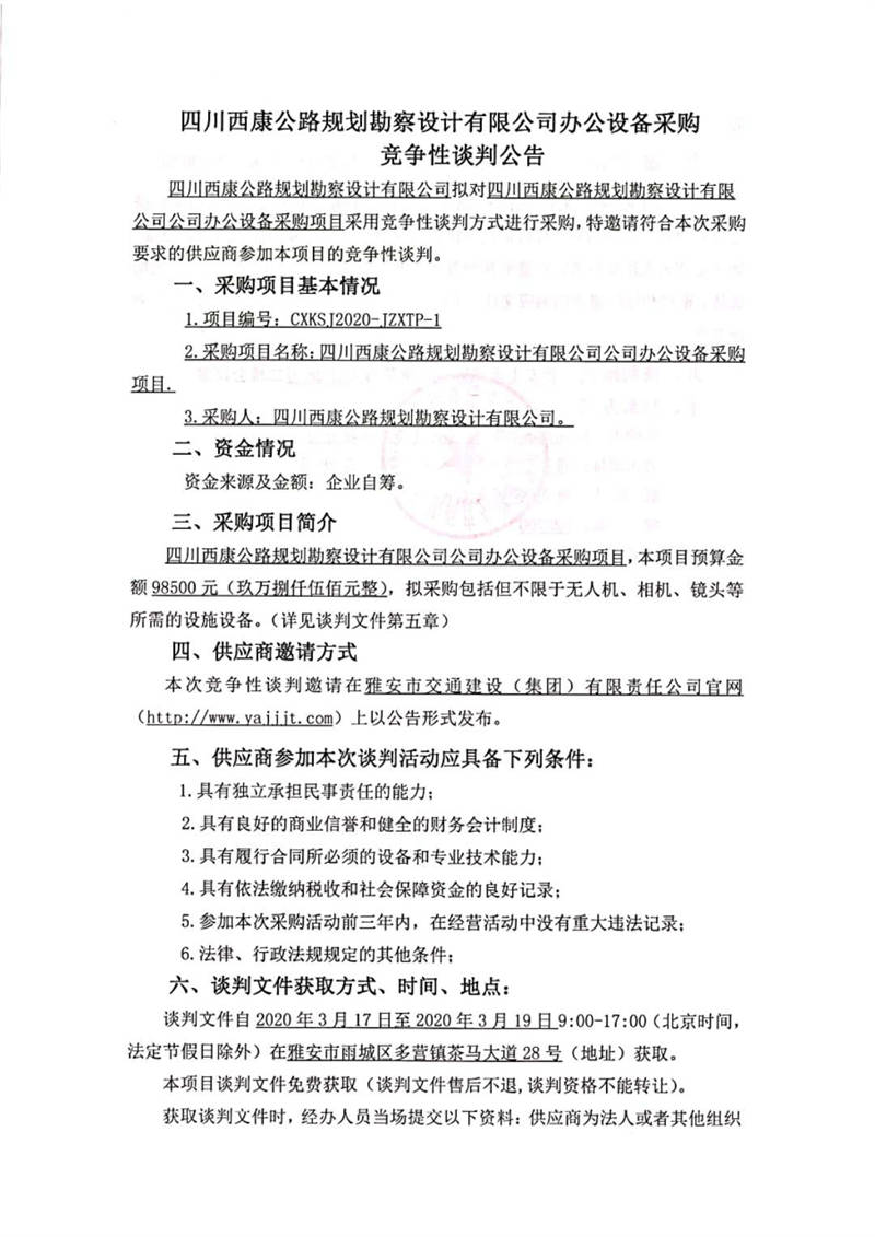 四川西康公路規(guī)劃勘察設(shè)計有限公司辦公設(shè)備采購競爭性談判公告