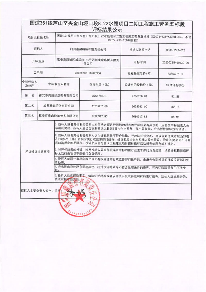 四川康藏路橋有限責任公司國道351線蘆山至夾金山埡口段8.22水毀項目二期工程施工勞務五標段評標結(jié)果公示