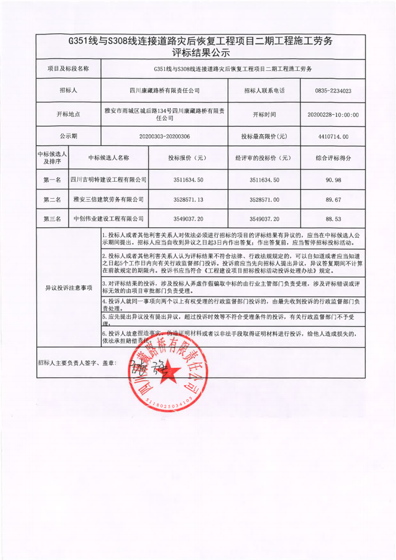 四川康藏路橋有限責任公司G351線與S308線連接道路災后恢復工程項目二期工程施工勞務評標結果公示