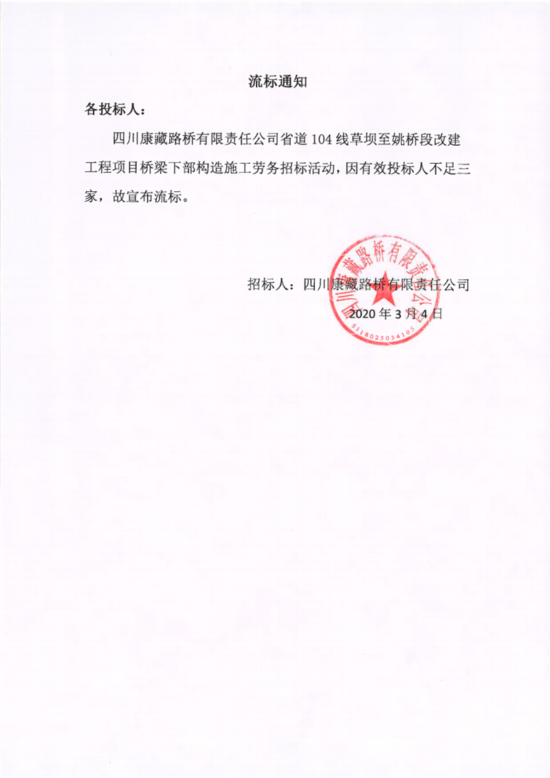 四川康藏路橋有限責(zé)任公司省道104線草壩至姚橋段改建工程項目橋梁下部構(gòu)造施工勞務(wù)流標(biāo)通知