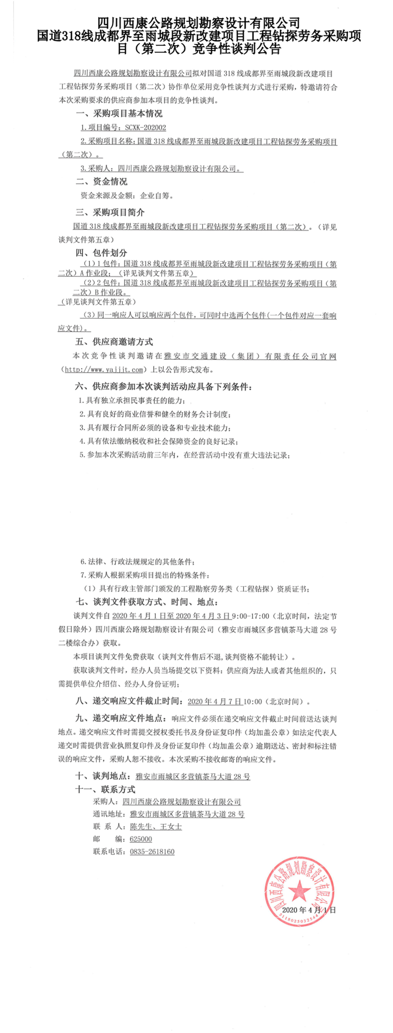 四川西康公路規(guī)劃勘察設(shè)計有限公司國道318線成都界至雨城段新改建項(xiàng)目工程鉆探勞務(wù)采購項(xiàng)目(第二次)競爭性談判公告