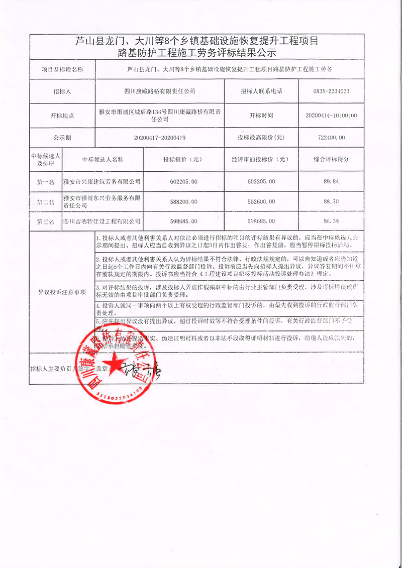 四川康藏路橋有限責(zé)任公司蘆山縣龍門、大川等8個鄉(xiāng)鎮(zhèn)基礎(chǔ)設(shè)施恢復(fù)提升工程項目路基防護(hù)工程施工勞務(wù)評標(biāo)結(jié)果公示