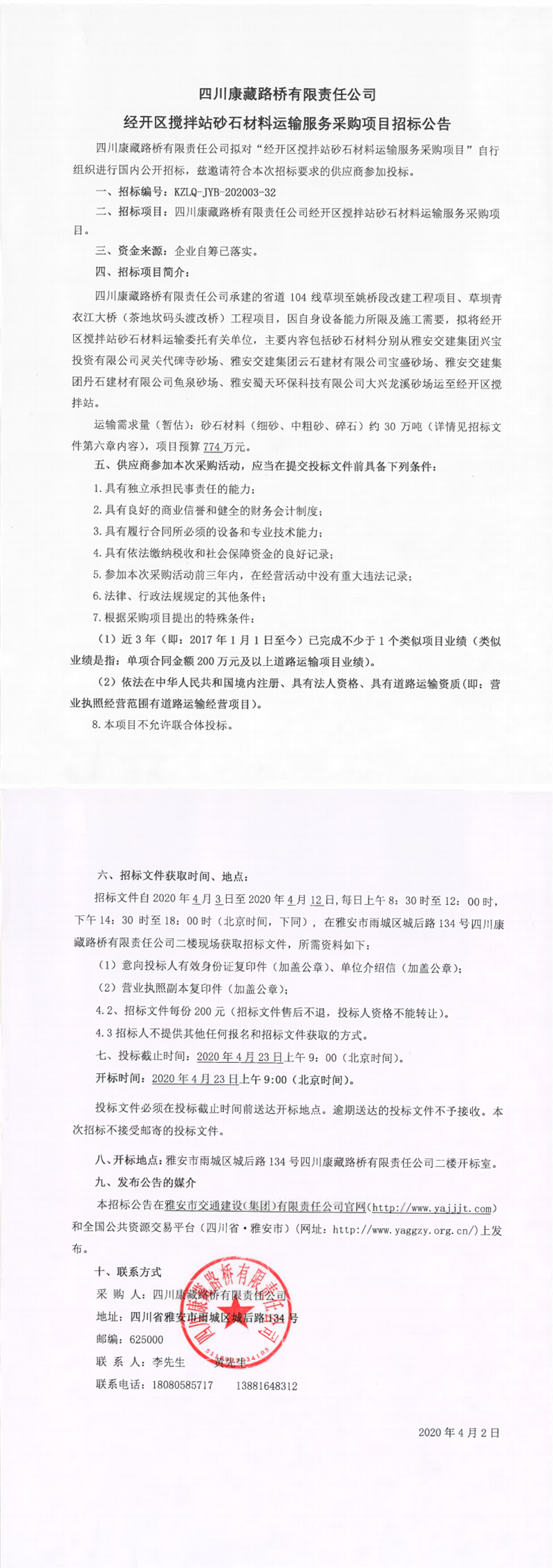 四川康藏路橋有限責任公司經(jīng)開區(qū)攪拌站砂石材料運輸服務采購項目招標公告