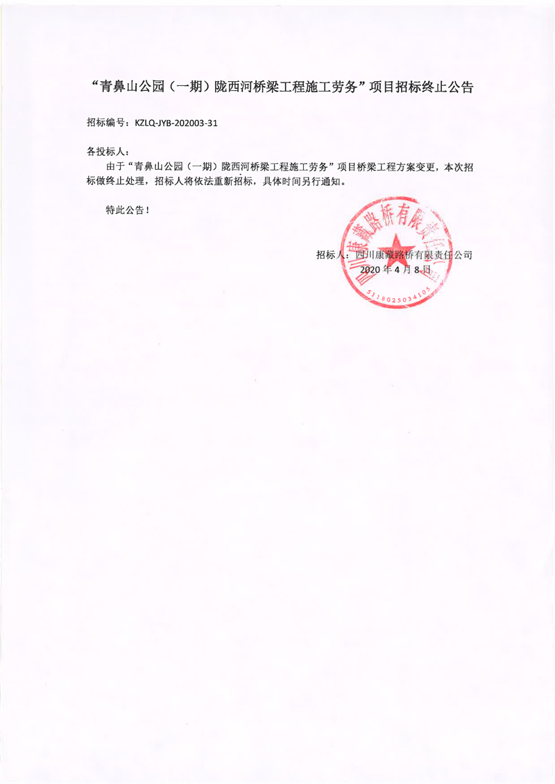 四川康藏路橋有限責(zé)任公司青鼻山公園(一期)隴西河橋梁工程施工勞務(wù)項目招標(biāo)終止公告
