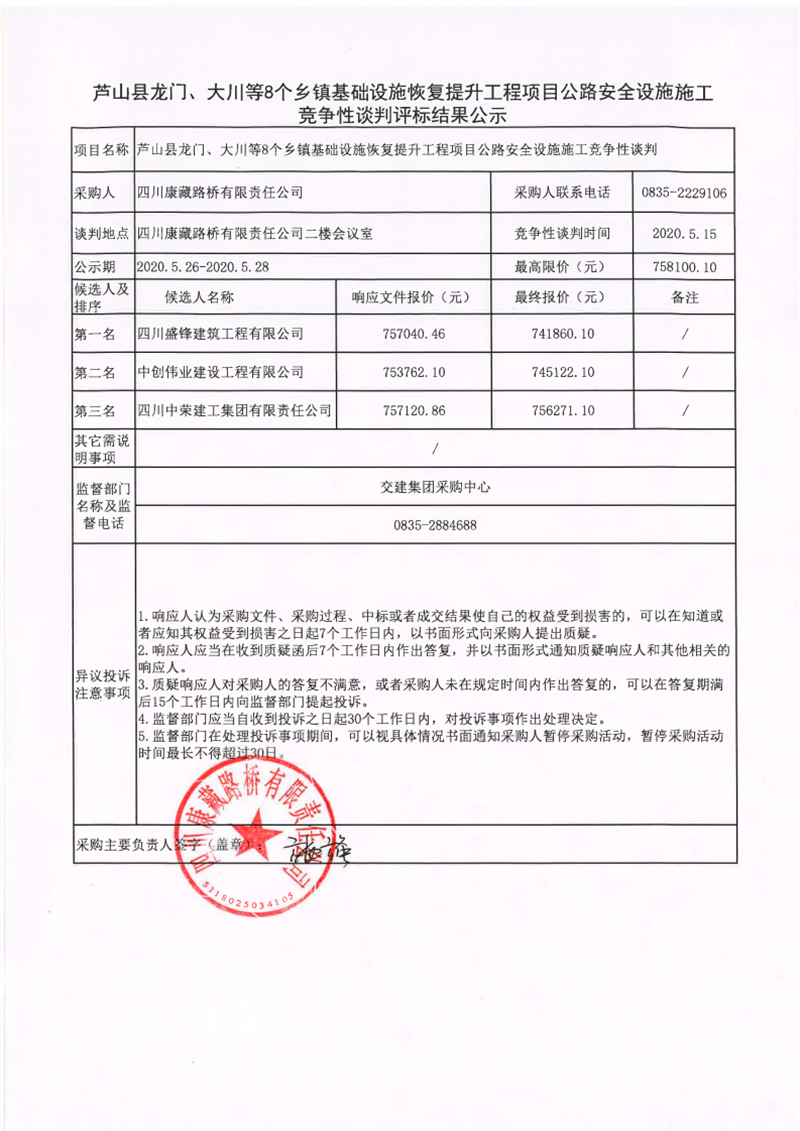 四川康藏路橋有限責任公司蘆山縣龍門、大川等8個鄉(xiāng)鎮(zhèn)基礎設施恢復提升工程項目公路安全設施施工競爭性談判評標結(jié)果公示