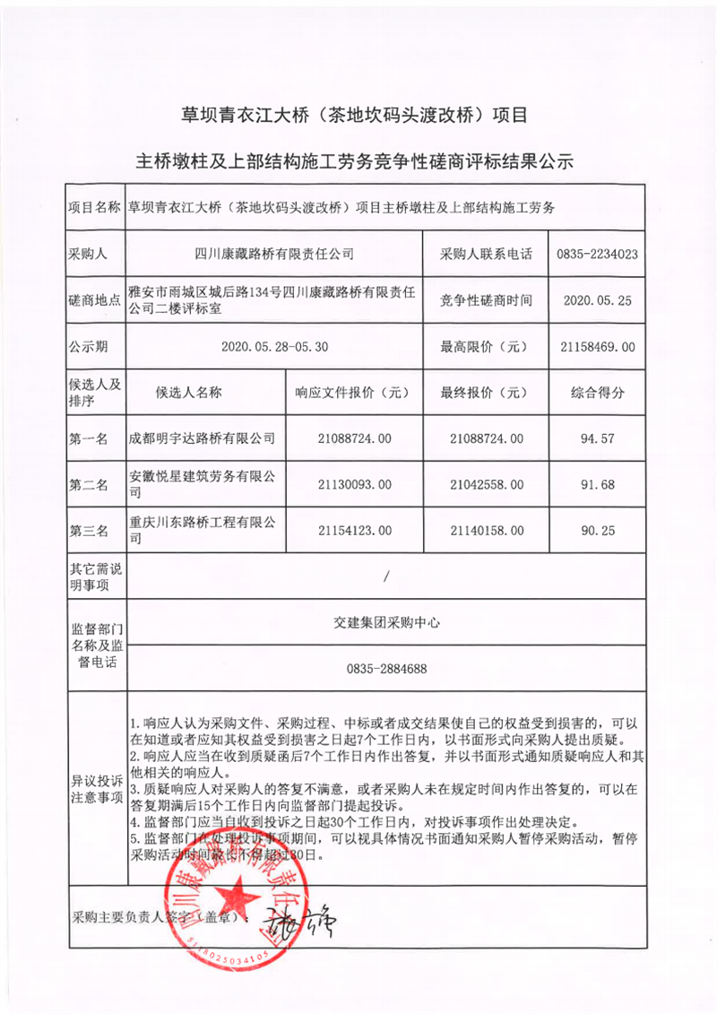 四川康藏路橋有限責任公司草壩青衣江大橋(茶地坎碼頭渡改橋)項目主橋墩柱及上部結(jié)構(gòu)施工勞務(wù)競爭性磋商評標結(jié)果公示