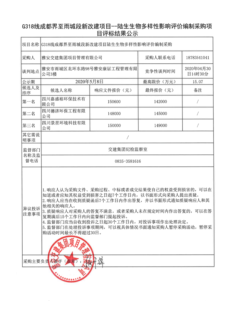 雅安交建集團(tuán)項(xiàng)目管理有限公司G318線成都界至雨城段新改建項(xiàng)目陸生生物多樣性影響評價編制采購項(xiàng)目評標(biāo)結(jié)果公示