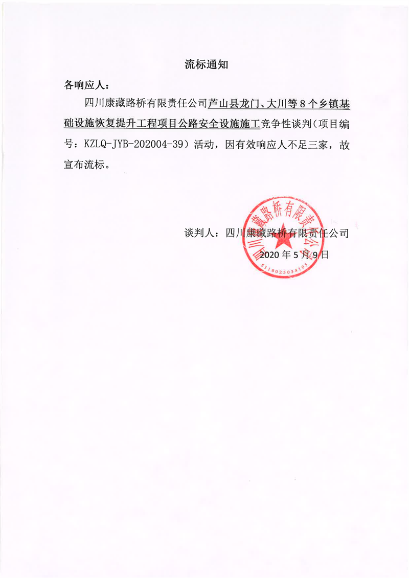 四川康藏路橋有限責(zé)任公司蘆山縣龍門、大川等8個鄉(xiāng)鎮(zhèn)基礎(chǔ)設(shè)施恢復(fù)提升工程項(xiàng)目公路安全設(shè)施施工競爭性談判流標(biāo)通知
