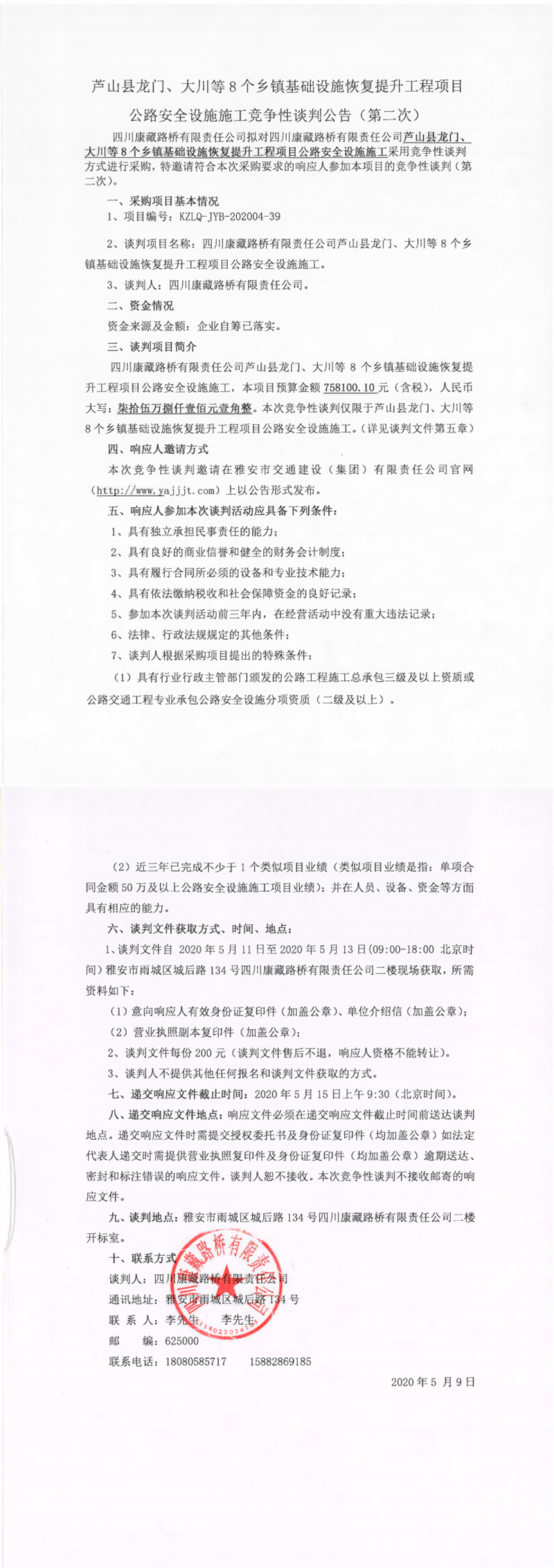 四川康藏路橋有限責(zé)任公司蘆山縣龍門、大川等8個(gè)鄉(xiāng)鎮(zhèn)基礎(chǔ)設(shè)施恢復(fù)提升工程項(xiàng)目公路安全設(shè)施施工競(jìng)爭(zhēng)性談判公告(第二次)