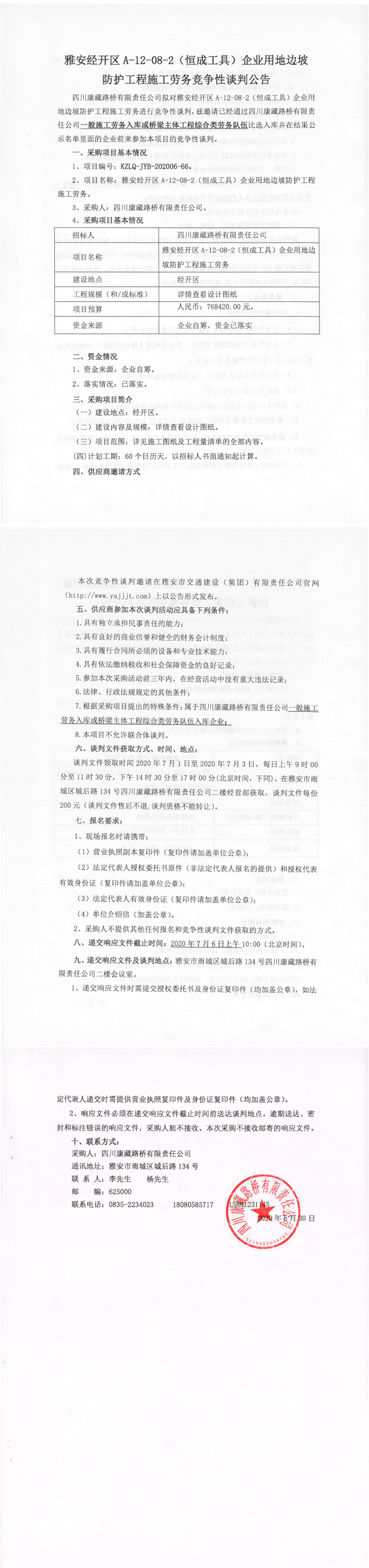 四川康藏路橋有限責任公司雅安經(jīng)開區(qū)A-12-08-2(恒成工具)企業(yè)用地邊坡防護工程施工勞務(wù)競爭性談判公告