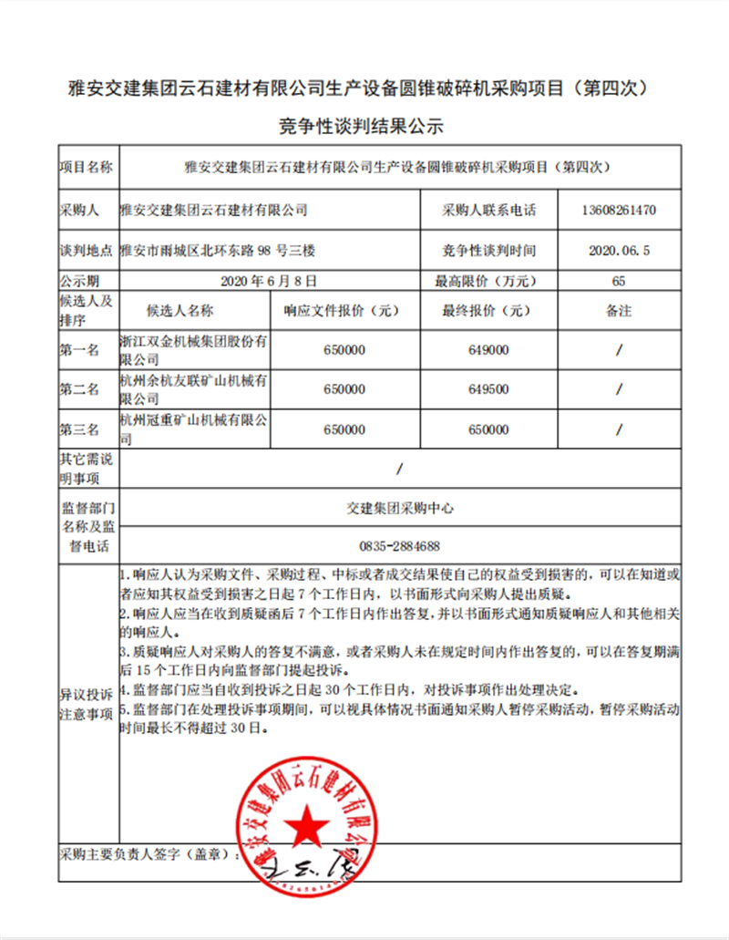雅安交建集團云石建材有限公司生產(chǎn)設備圓錐破碎機采購項目(第四次)競爭性談判結果公示
