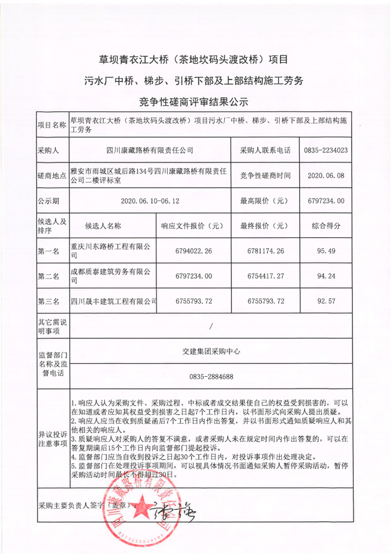 四川康藏路橋有限責(zé)任公司草壩青衣江大橋(茶地坎碼頭渡改橋)項(xiàng)目污水廠中橋、梯步、引橋下部及上部結(jié)構(gòu)施工勞務(wù)競(jìng)爭(zhēng)性磋商評(píng)審結(jié)果公示