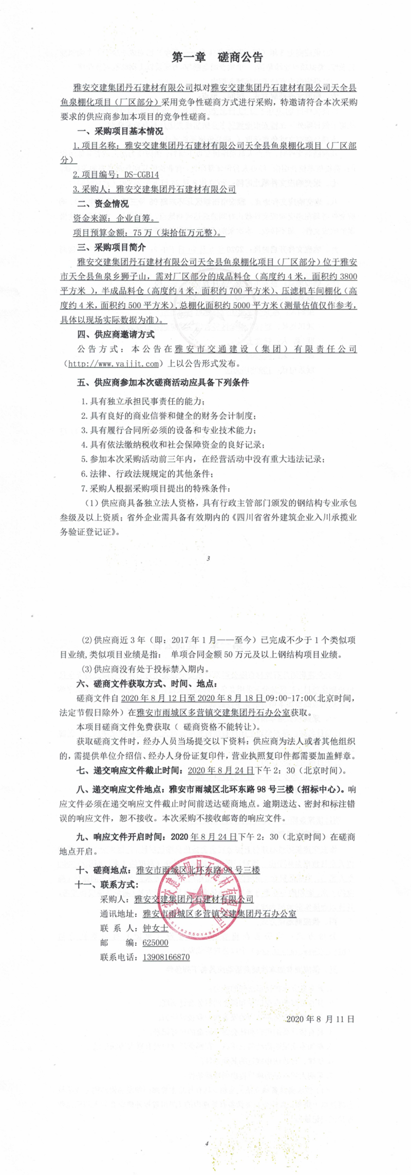 雅安交建集團(tuán)丹石建材有限公司天全縣魚泉棚化項(xiàng)目(廠區(qū)部分)競(jìng)爭(zhēng)性磋商公告