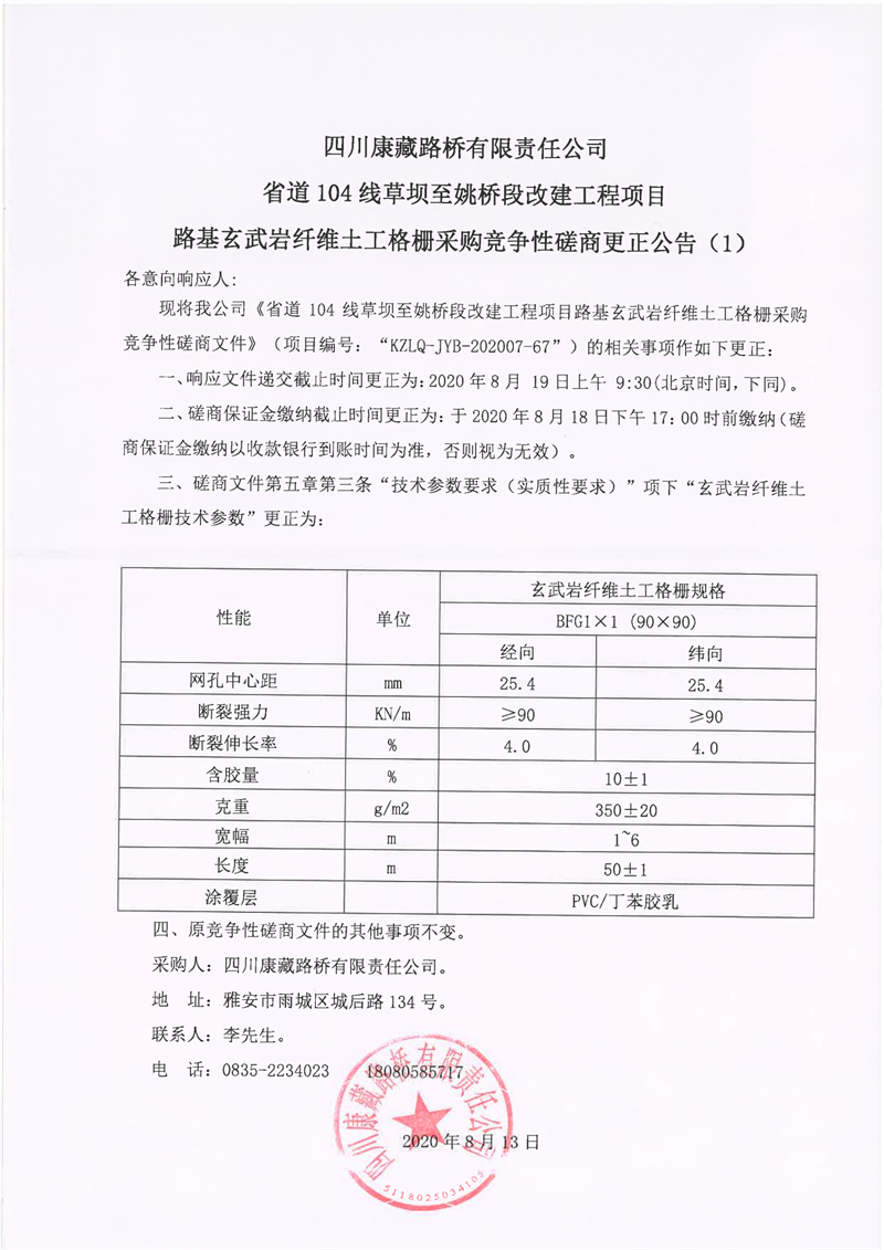 四川康藏路橋有限責(zé)任公司省道104線(xiàn)草壩至姚橋段改建工程項(xiàng)目路基玄武巖纖維土工格柵采購(gòu)競(jìng)爭(zhēng)性磋商更正公告(1)