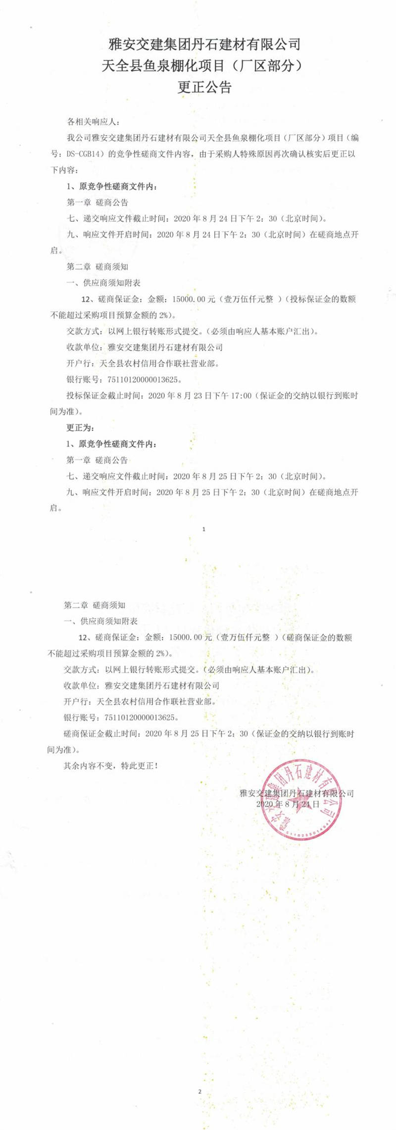 雅安交建集團(tuán)丹石建材有限公司天全縣魚(yú)泉棚化項(xiàng)目(廠區(qū)部分)更正公告