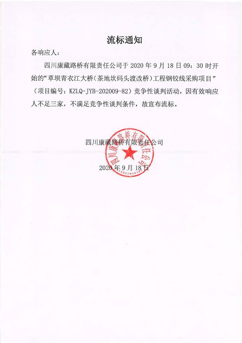 四川康藏路橋有限責(zé)任公司草壩青衣江大橋(茶地坎碼頭渡改橋)工程鋼鉸線(xiàn)采購(gòu)項(xiàng)目流標(biāo)通知