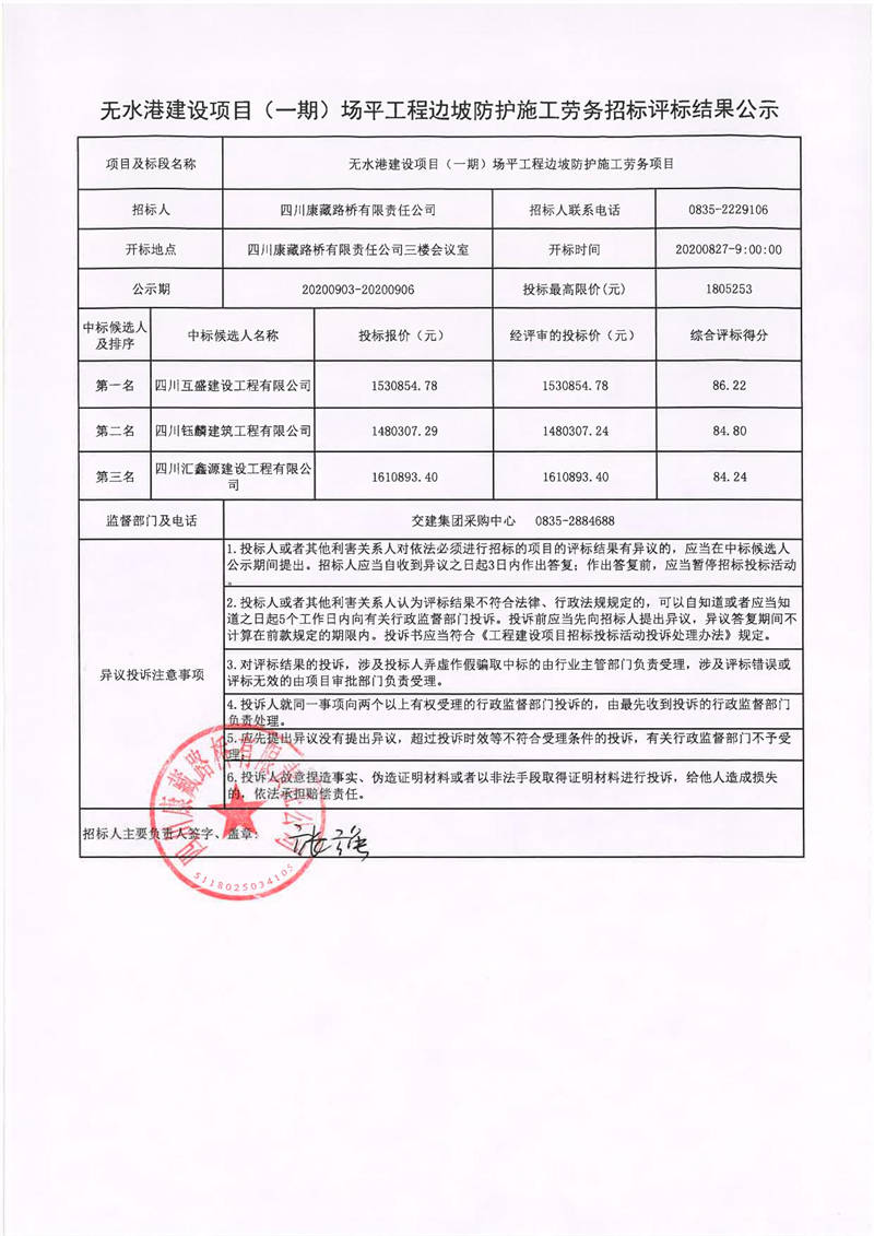 四川康藏路橋有限責(zé)任公司無水港建設(shè)項目(一期)場平工程邊坡防護(hù)施工勞務(wù)招標(biāo)評標(biāo)結(jié)果公示
