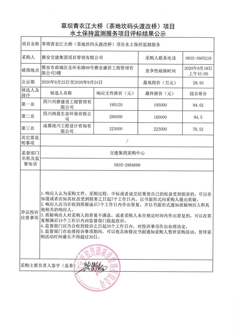 雅安交建集團項目管理有限公司草壩青衣江大橋(茶地坎碼頭渡改橋)項目水土保持監(jiān)測服務(wù)項目評標(biāo)結(jié)果公示