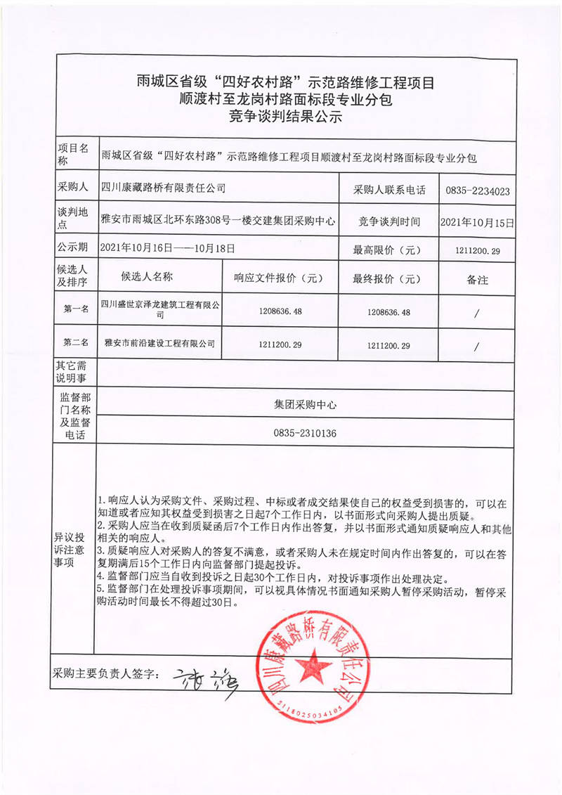 四川康藏路橋有限責(zé)任公司雨城區(qū)省級“四好農(nóng)村路”示范路維修工程項目順渡村至龍崗村路面標(biāo)段專業(yè)分包競爭談判結(jié)果公示